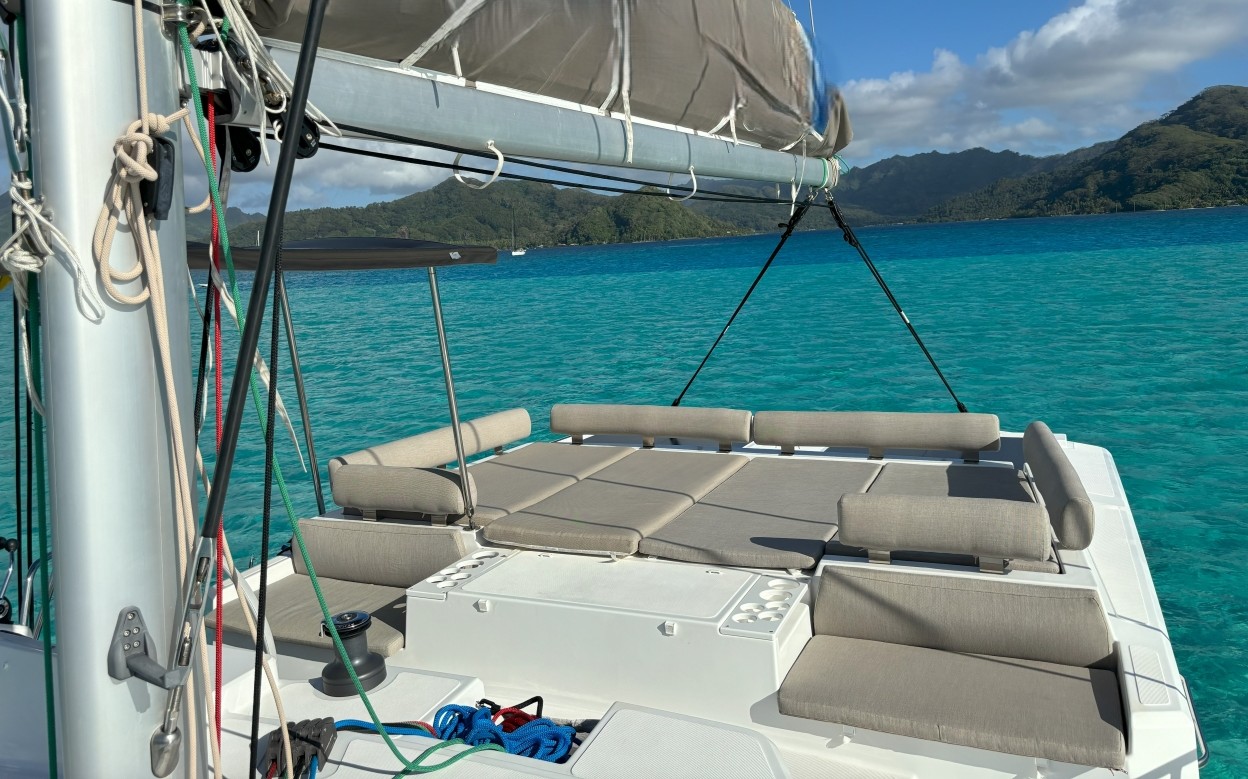Head up to the flybridge and you'll find a spacious chill zone with plenty of room to unwind, plus a helm station that's a breeze to handle with a small crew, including a self-tacking foresail. It's all about smooth sailing and good vibes.